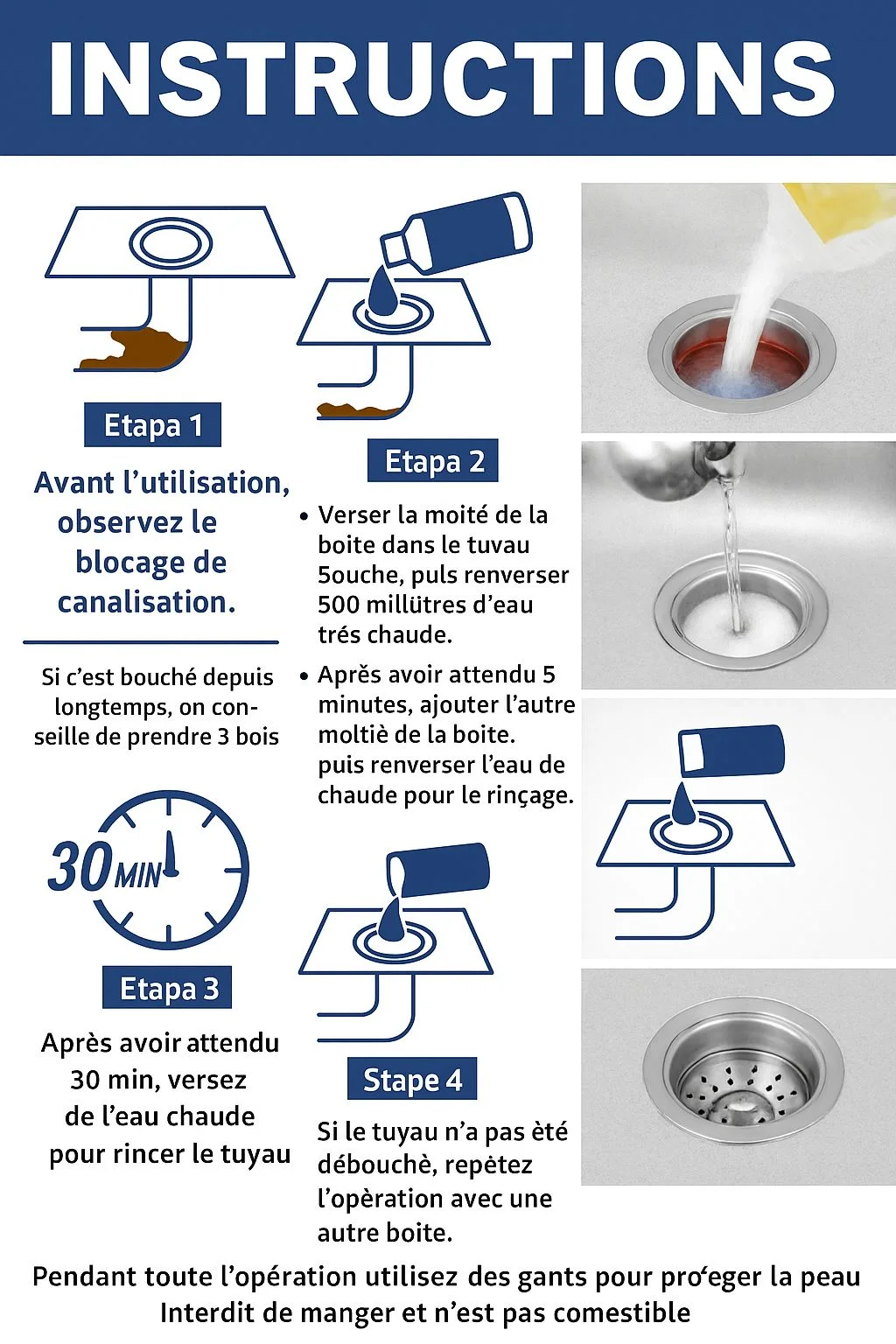 Une utilisation simple en 4 étapes, avec livraison rapide et paiement sécurisé. Comment l’utiliser : 1️⃣ Versez dans la canalisation 2️⃣ Laissez agir 5-10 minutes 3️⃣ Rincez à l’eau claire 4️⃣ Canalisation propre et dégagée